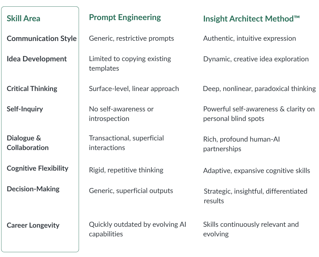 In a rapidly evolving AI landscape, surface-level imitation and copy-paste conformity aren’t enough. The Insight Architect Method™ equips you with differentiated skills to truly set you apart.